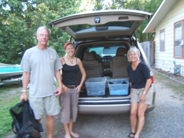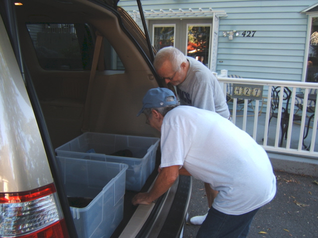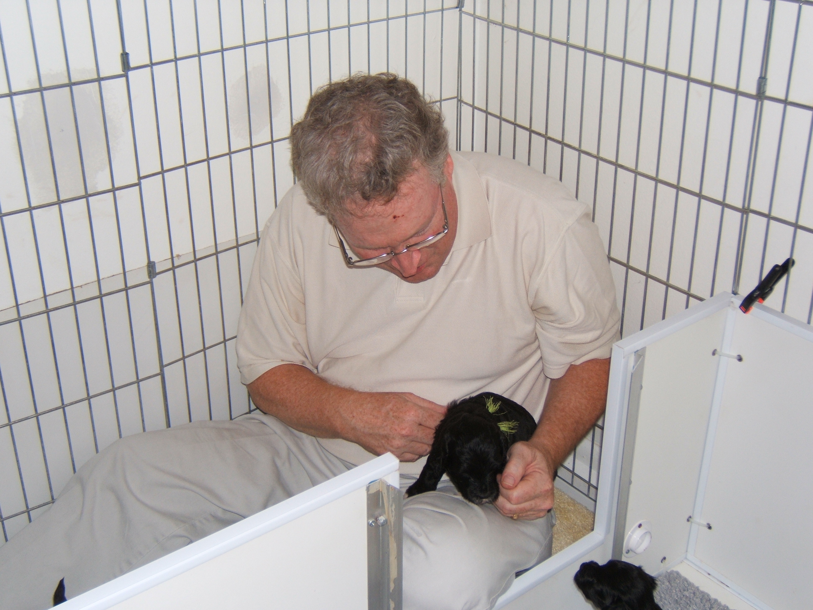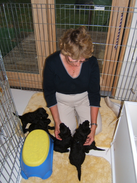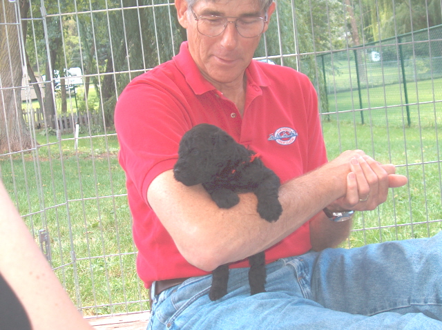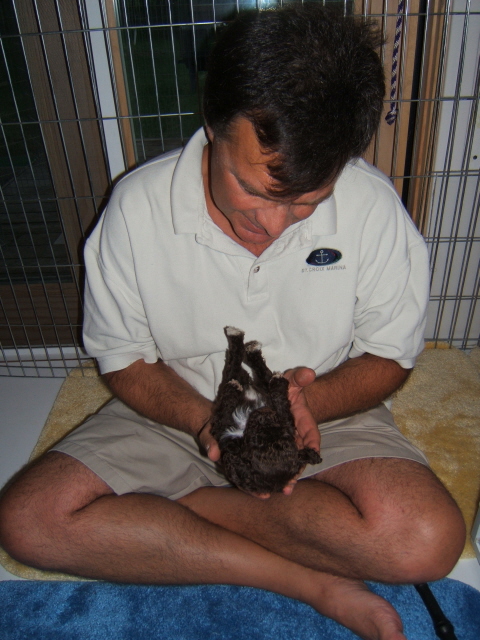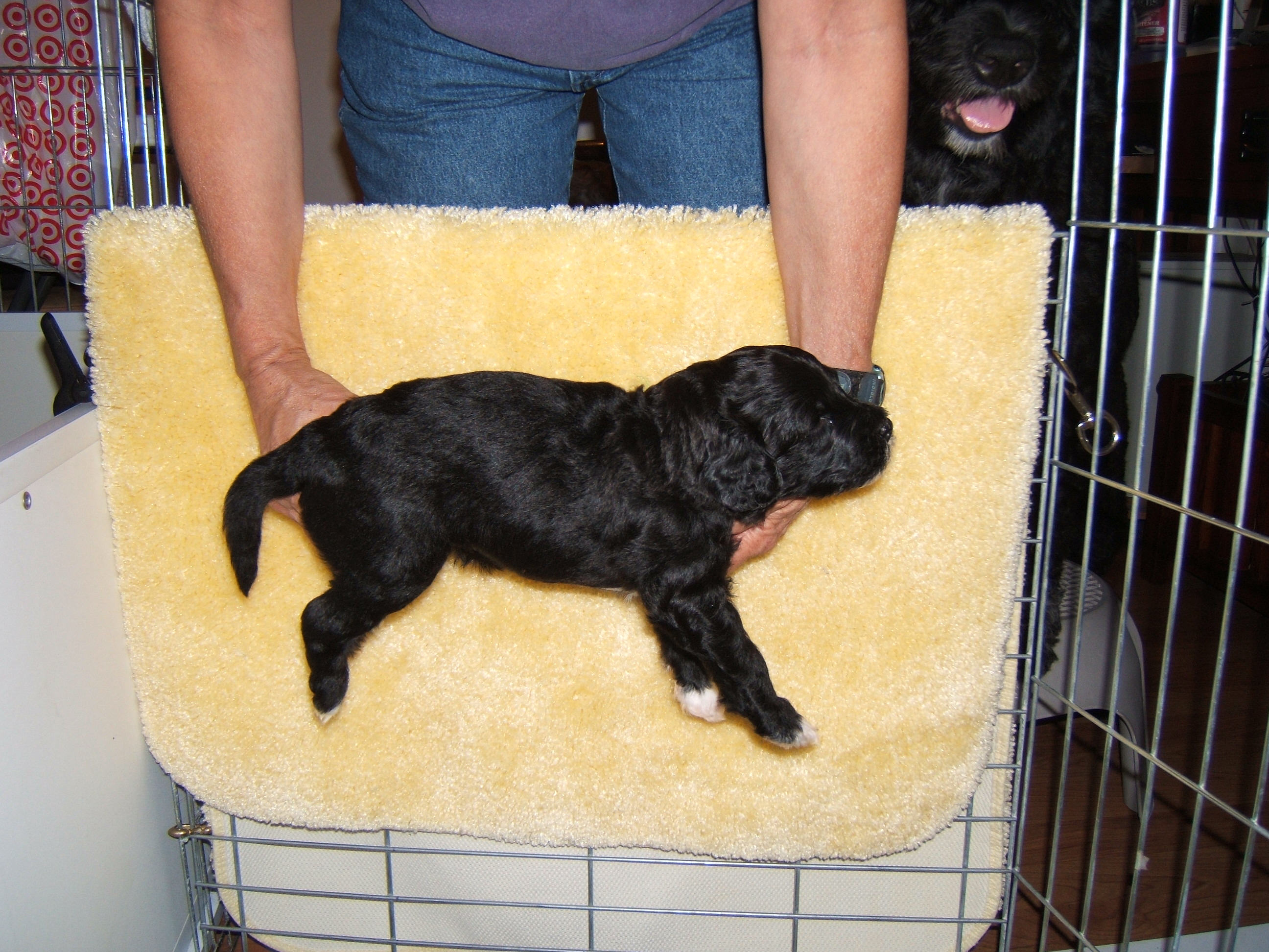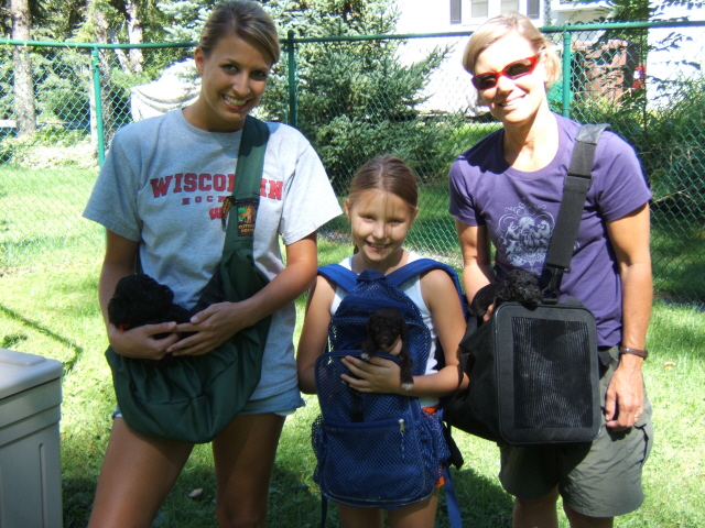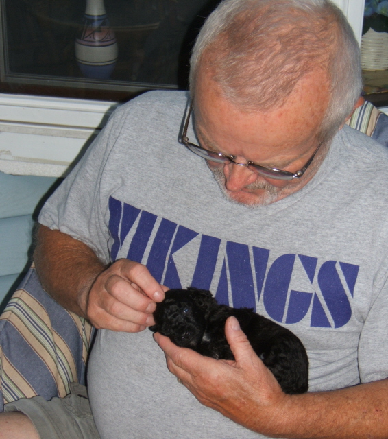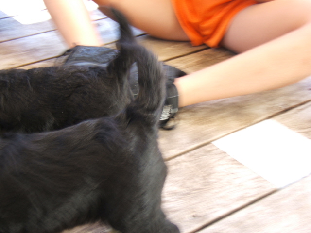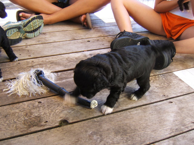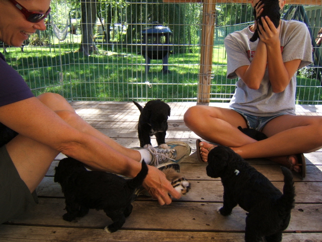 The social whirl continued with a car ride to visit neighbors, visitors arriving for the TC Specialty weekend, first trip to the deck, beginning to see toys, and Sherpa bag rides. Our huge thanks to Steve, Mary, Ann, Harlow, Sally, Chip, Bev, Anne, Katie, Marv, Karen, Melissa, Bill, Sue, Joanne, Kaitlin, Drew, Scott, and Candy! First lapping from saucers, followed quickly by first gruel. Chip~The car ride crew~Brown boy